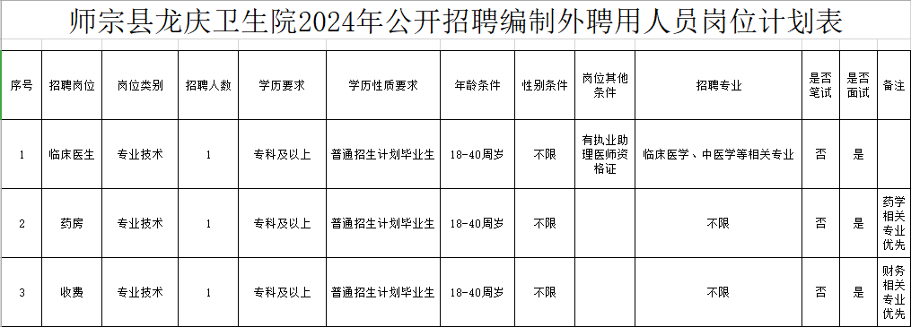 详见附件《师宗县龙庆卫生院2024年公开招聘编外聘用人员计划表》。