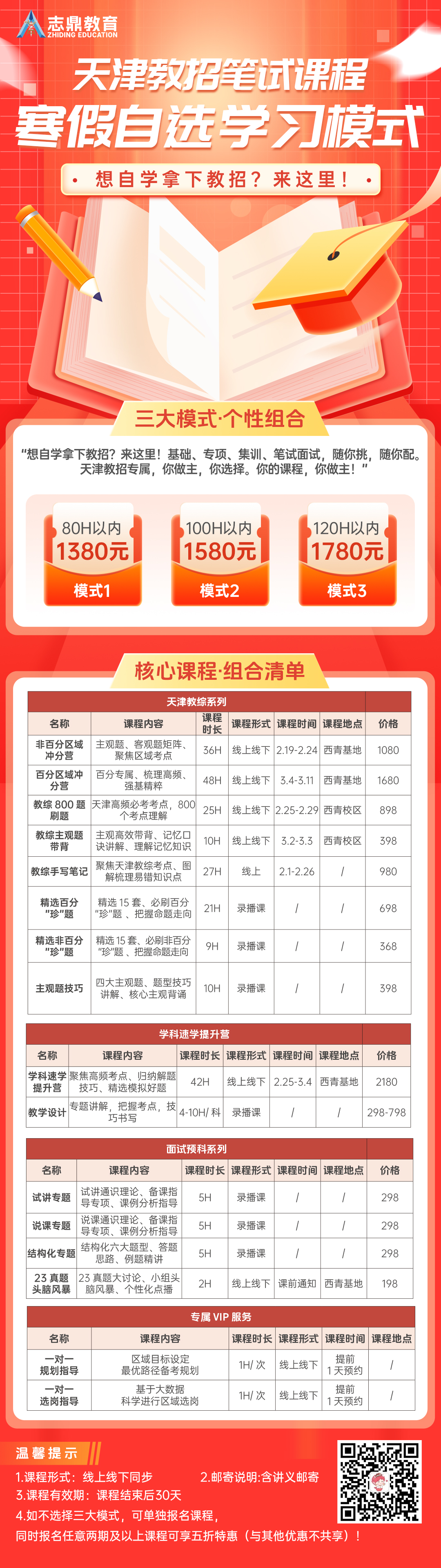 志鼎教育《寒假自选课程》&《2月学科突破课》详细安排已出,《寒假自选课程》的意义在于适用于多个阶段的考生进行冲刺。聚焦于天津教招的特色进行系列课程培训,同时也会针对个别题型安排课程进行专项指导,像教综主观题等类似课程。