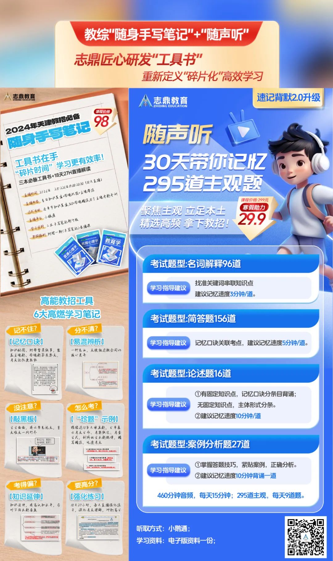 此外,近期志鼎教育推出了一种教招备考的新模式《教综“随身手写笔记”+“随声听”》,适用于大家在平时利用“碎片时间”进行备考,这样能更好帮助大家进行对模块知识点的巩固复习,加深印象。想要了解课程详情的考生可扫描图中二维码进行了解哦。