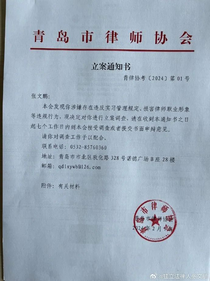 本会发现你涉嫌存在违反实习管理规定、损害律师职业形象等违规行为,现决定对你进行立案调查,请在收到本通知书之日起七个工作日内到本会接受调查或者提交书面申辩意见。