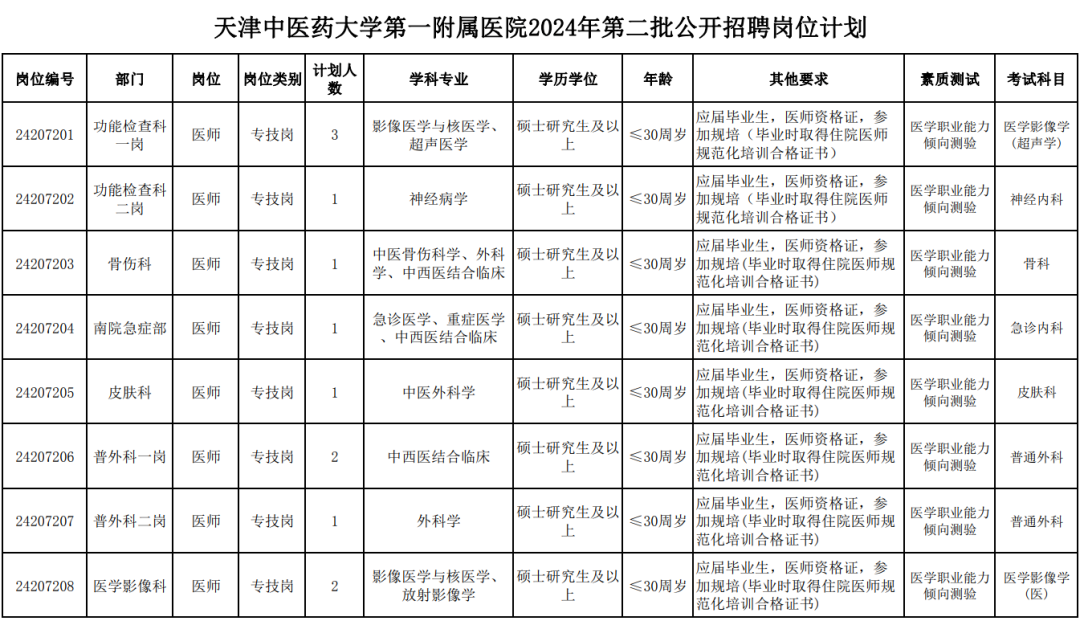 具体招聘岗位见《天津中医药大学第一附属医院2024年第二批公开招聘岗位计划》。