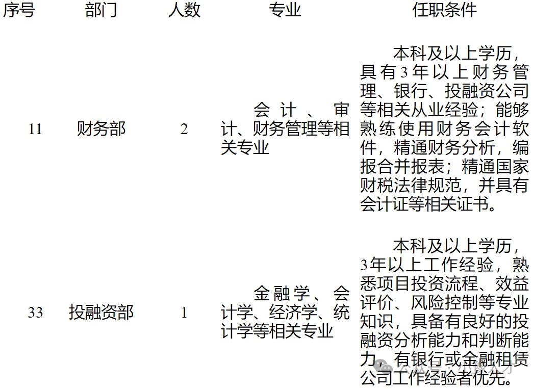 现因工作需要,拟面向社会公开招聘人才,此次招聘涉及财务部、投融资部、工程部三个部门,现将有关事项公告如下:
