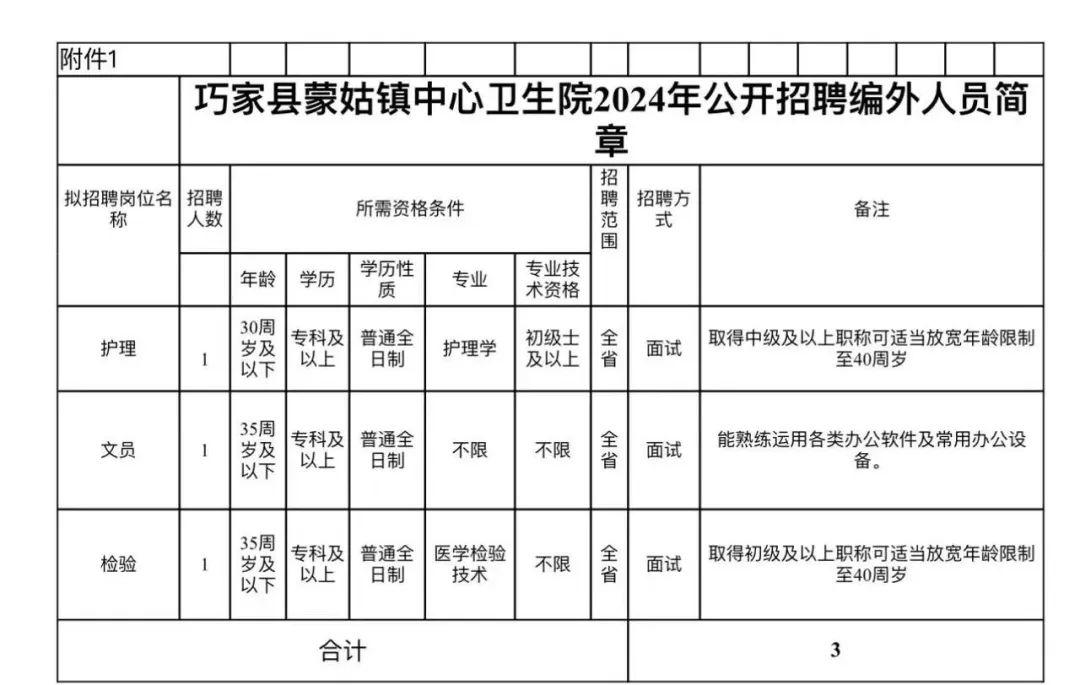 巧家县蒙姑镇中心卫生院,是一所集全科医疗、预防保健、健康教育、计划生育、卫生计生监督协管及村(社区)卫生室行政管理等为一体的综合卫生院,我院现有职工35人,开设诊疗科目包括预防保健、全科医疗、中医科、医学检验科(临床体液、血液专业)、医学影像科(DR、B超、心电图)等科室,现因医院业务发展需求,特面向社会公开招聘编外人员3名,现将招聘有关事项公告如下