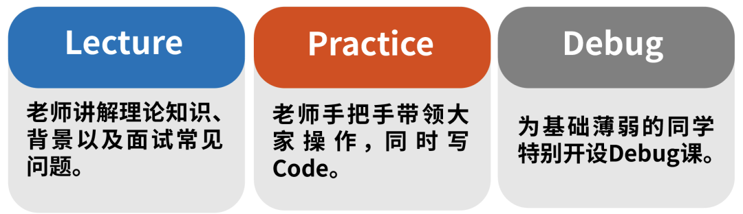 课程采用Lecture+Practice+Debug三合一模式,帮助大家彻底摆脱基础不扎实和动手能力不足的问题。