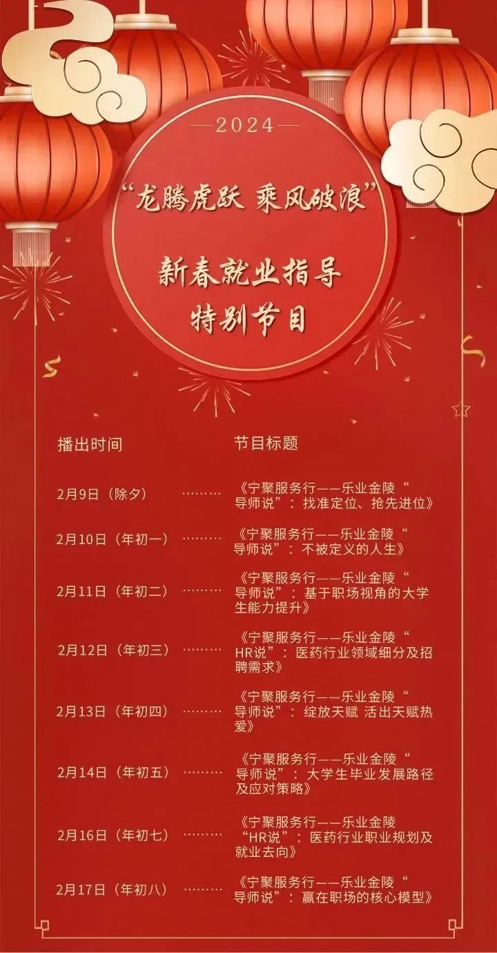 2月9日至2月17日,《HR直播间》联合市人社局共同推出了9期《“龙腾虎跃 乘风破浪”——2024年新春就业指导特别节目》,每晚19:30在南京电视台娱乐频道《HR直播间》播出,南京电视台牛咔视频客户端同步推送。节目围绕大学生关注的就业政策、就业形势、求职技巧等话题,依托网络平台,持续播出就业指导公益课程,以此提升大学生求职技能,实现更充分更高质量就业。欢迎大学生同学们及时收听收看。