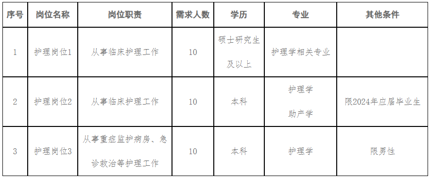 4.往届生须有三甲医院3年及以上护理工作经验,并具有《护士执业证书》,助产士要求具有《母婴保健技术考核合格证》,能独立接生。