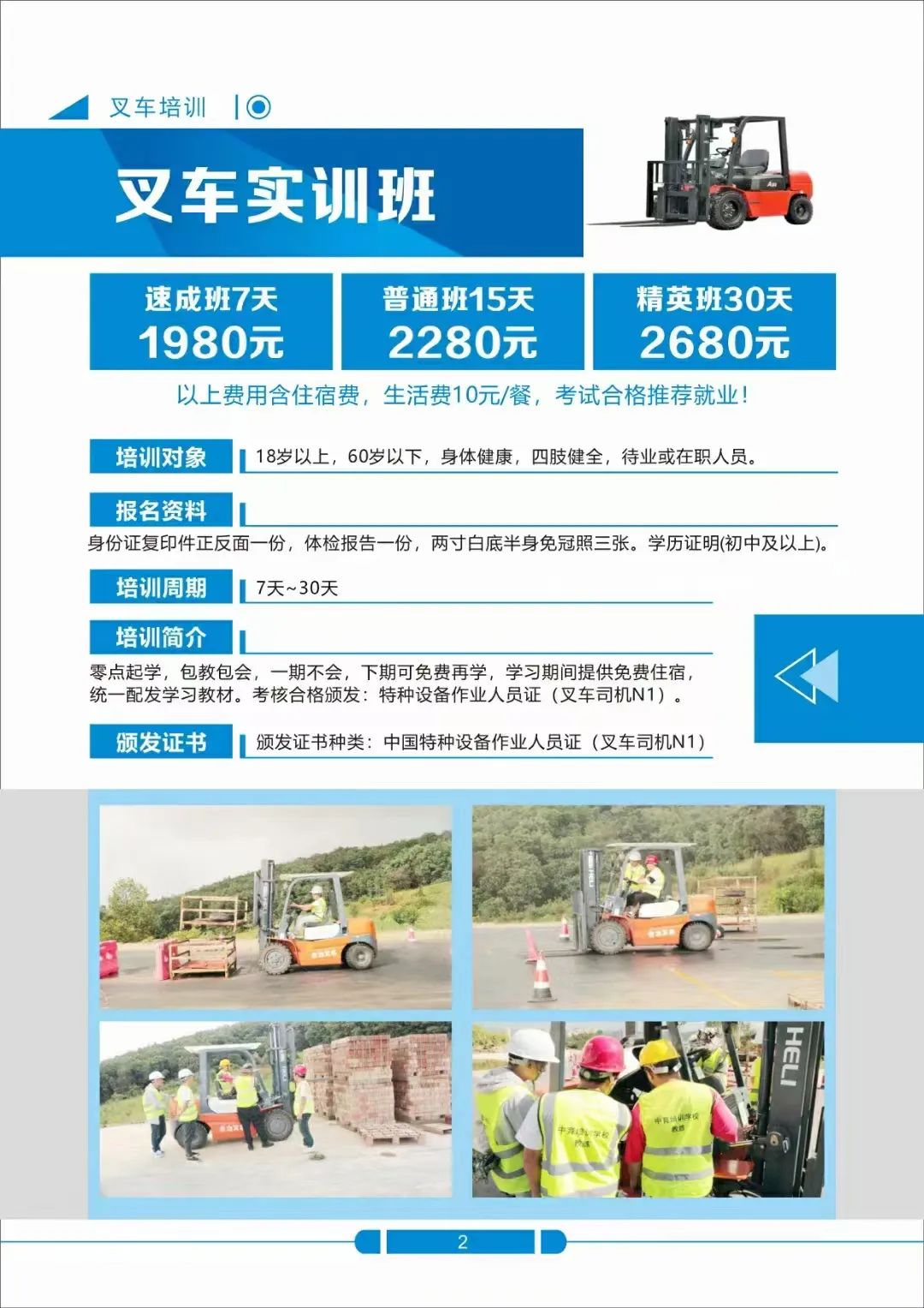 培训内容:叉车工作原理结构;内燃叉车及电瓶叉车安全技术,车辆稳定性和安全操作,叉车日常维护及故障排除;叉车的一、二、三级保养,机动车辆的防火技术;规范驾驶操作:启动、起步、行车、倒车、转向、搬运、装卸、各项堆垛作业规程;厂内运输驾驶员身心健康与安全,厂内运输常见事故的原因分析和预防。