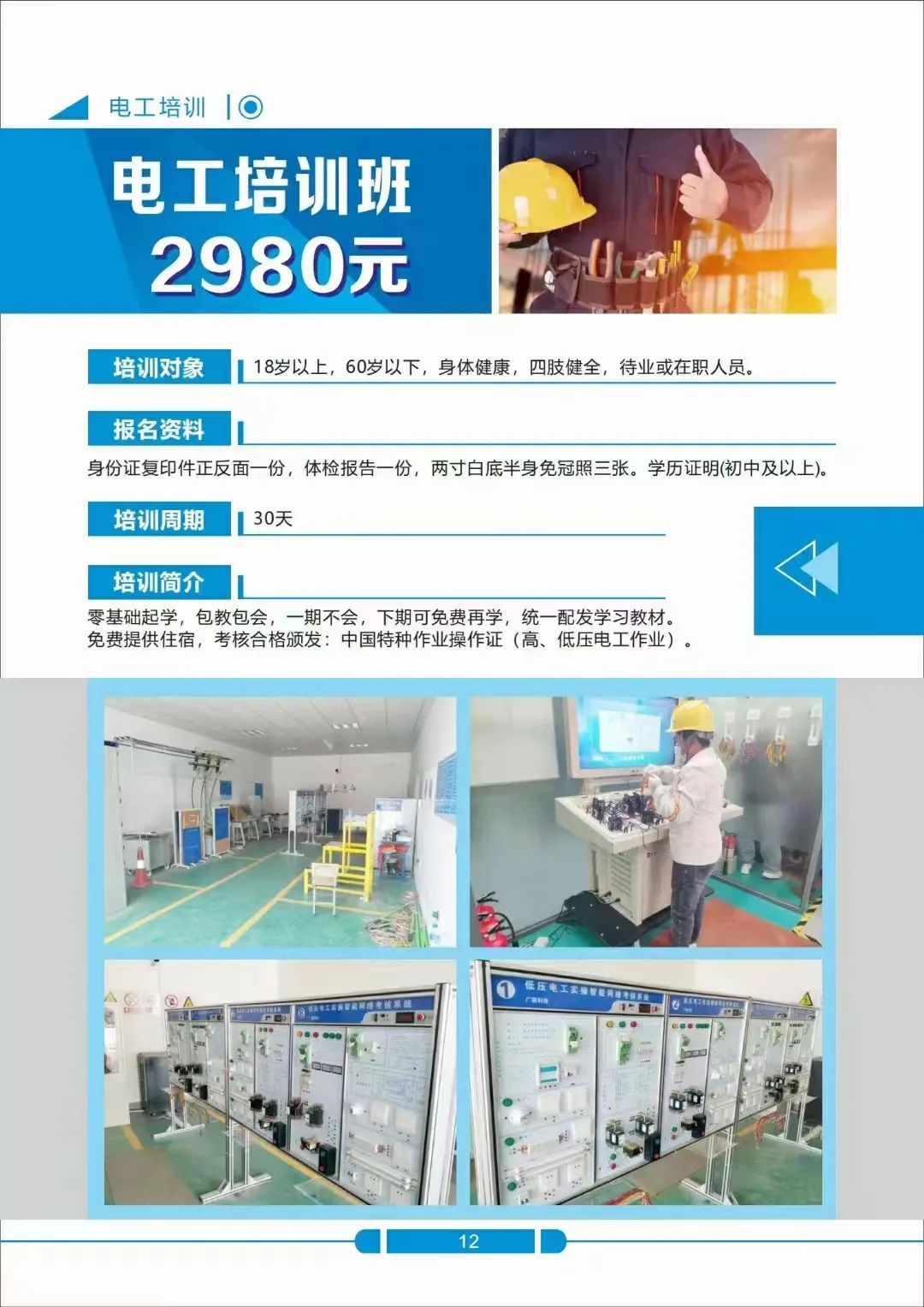 培训内容:安全技术基础知识与急致,认识常用工具及材料,电气识图,安装电工操作技能,电机与变压器的使用与维修,三相异步电地动机控线路的安全和检修,电子元件的识别与测试,电工仪器仪表的使用与维护,变压器和电焊机的使用与维修,电动机和特种电机的使用与维修,电动机复杂控制电路的安装与维修,一般机械设备电气控制电路的检修,可编程序控制应用技术,企业内供电系统的操作与维护。