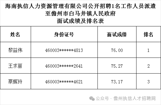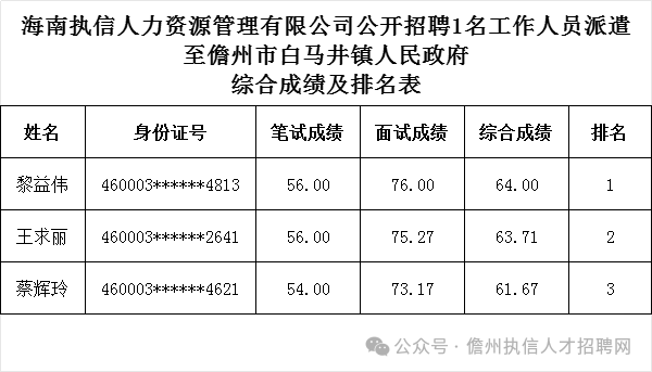 因工作需要,儋州市白马井镇人民政府拟通过购买服务方式委托海南执信人力资源管理有限公司(简称:执信人力)面向社会公开招聘1名工作人员的面试成绩及综合成绩公布如下: