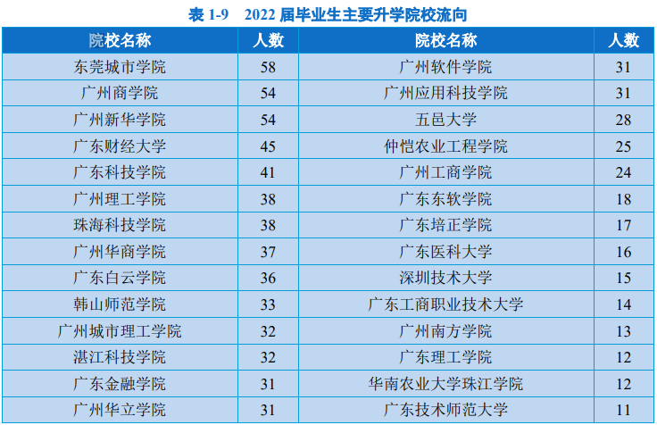 就业:学校2022届毕业生中95.93%的毕业生选择在省内就业;就业行业以“制造业”为主;就业单位以“其他企业(主要为民营企业)”为主。就业专业对口度:毕业生目前就职岗位与所学专业的相关度为78.92%,均值为3.51 分(5分制),偏向“比较相关”水平。分院系来看,专业相关度最高的是医药卫生学院(93.37%),其次是智能制造学院(89.13%);专业相关度最低的学院是酒店与旅游管理学院(55.06%)。升学:2022届毕业生中,共有886名学生选择国内升学,占14.76%。升学首要原因是为了“增加择业资本、站在更高的求职起点”(71.72%),其次是“提升综合素质/能力”(63.56%)。毕业生升学院校主要流向了东莞城市学院、广州商学院、广州新华学院等高校。校园环境:
