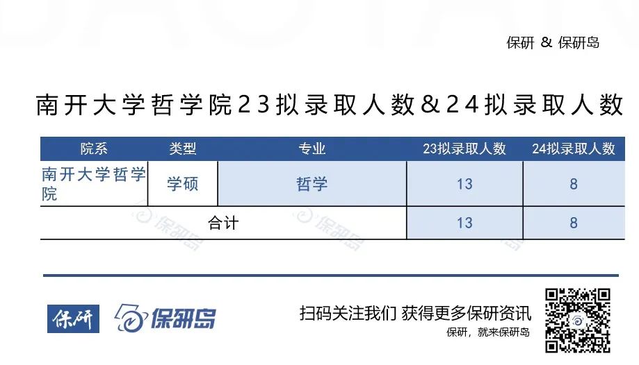 南开大学哲学院录取规模较小,23年录取13人,24年则减少至8人。