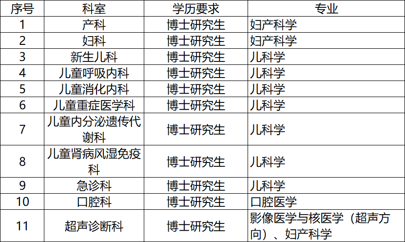 (1)专业:妇产科学、儿科学、外科学(神外、泌尿外、普外、胸心外、骨外、整形)、内科学、麻醉学、影像医学与核医学等相关医学专业;