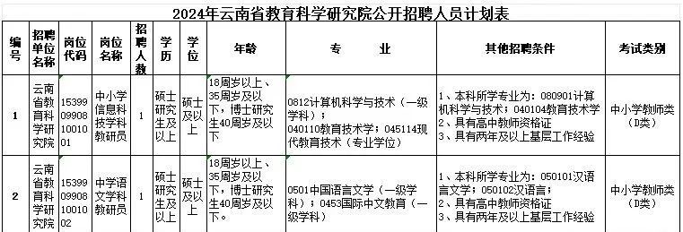 云南省教育科学研究院公开招聘工作人员2名。具体招聘岗位及招聘条件,详见《2024年云南省教育科学研究院公开招聘人员计划表》(附件1)。