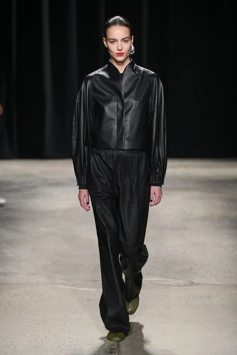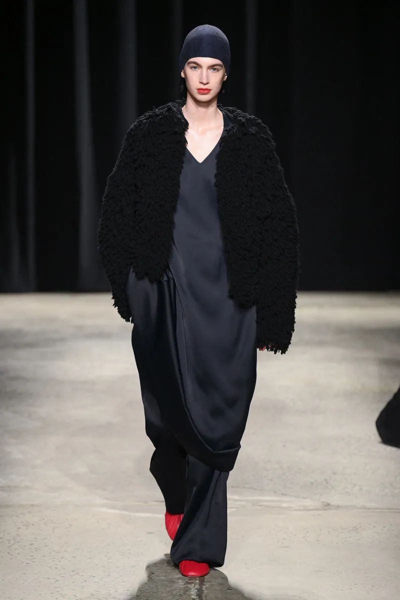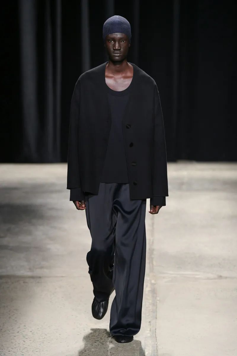 这位荷兰设计师——除了帮助The Row推出男装,还为Maison Martin Margiela工作,并与马克·雅可布一起为路易威登工作——在颜色方面很克制,专注于奶油色、靛蓝、红色、黑色、灰褐色和橄榄色的紧凑调色板。纺织品也是如此:2024年秋季系列使用府绸、煮熟的羊毛、回收尼龙和锤纹皮革。