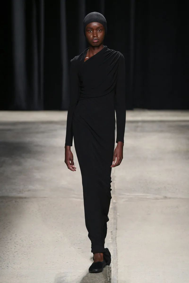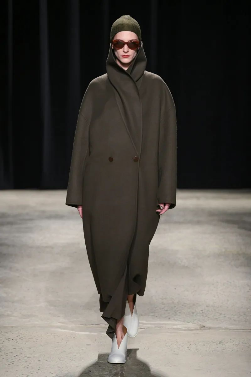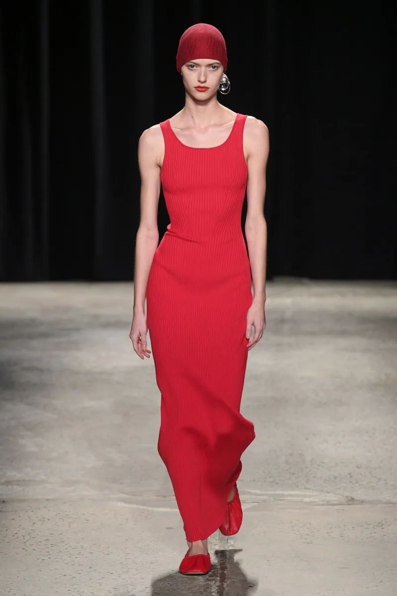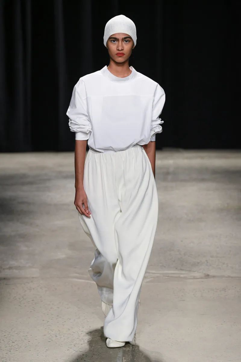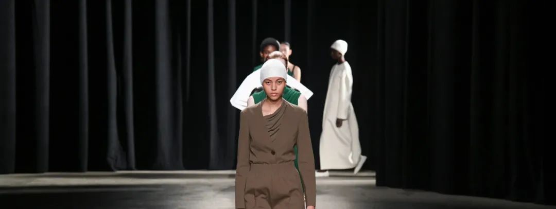 在T台上,迷幻民谣艺术家Anastasia Cooper唱歌时,模特们穿着芭蕾舞平底鞋优雅地大步走着。编织的无檐帽非常舒适,看起来像游泳帽,是明星配饰。
