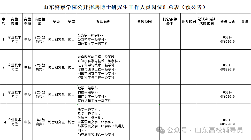 山东警察学院2024年拟面向社会公开招聘博士研究生工作人员,具体专业及条件详见(附件1)。