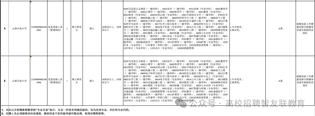 资格初审由云南开放大学负责,采用计算机和人工审核相结合的方式进行,具有专业要求的岗位由云南开放大学进行人工审核。所学专业不在选定的参考目录中,但与岗位所要求的专业类同的应聘人员,可以主动联系招聘单位确认报名资格。