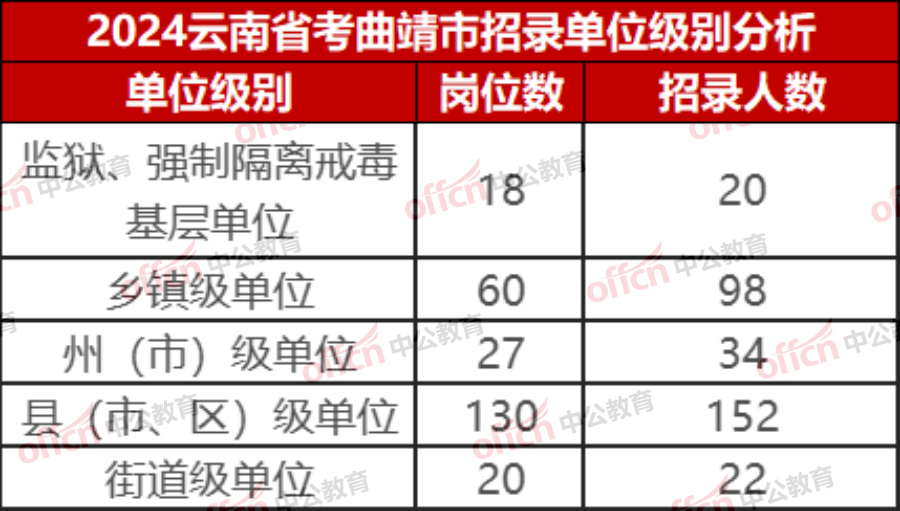 从上表中可以看出,今年曲靖市岗位以县级和乡镇级单位为主,招录人数分别为152人和98人。希望大家能通过本次分析更深入了解曲靖市岗位招录情况,选好岗位!