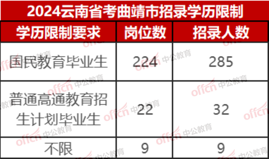 学历限制方面,曲靖市省考设国民教育毕业生设岗224个,招考人数285人;普通高等教育毕业生岗位22个,招录人数32人;学历性质不限的岗位设立9个,招录9人。如上图所示。