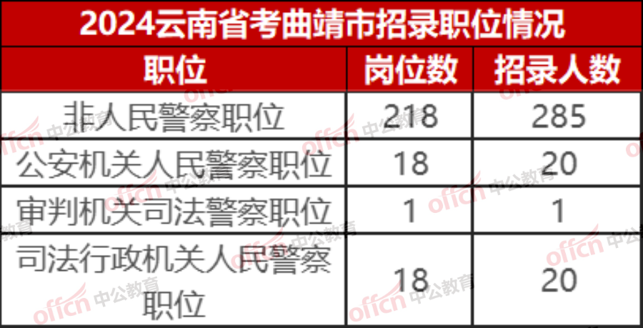 曲靖市2024年省考招录职位:非人民警察职位设立218个,招录285人;公安机关人民警察职位设岗18个,招录人数20人;审判机关司法警察职位设岗1个,招录人数1人;司法行政机关人民警察职位设岗18个,招录人数20人,如上图所示。
