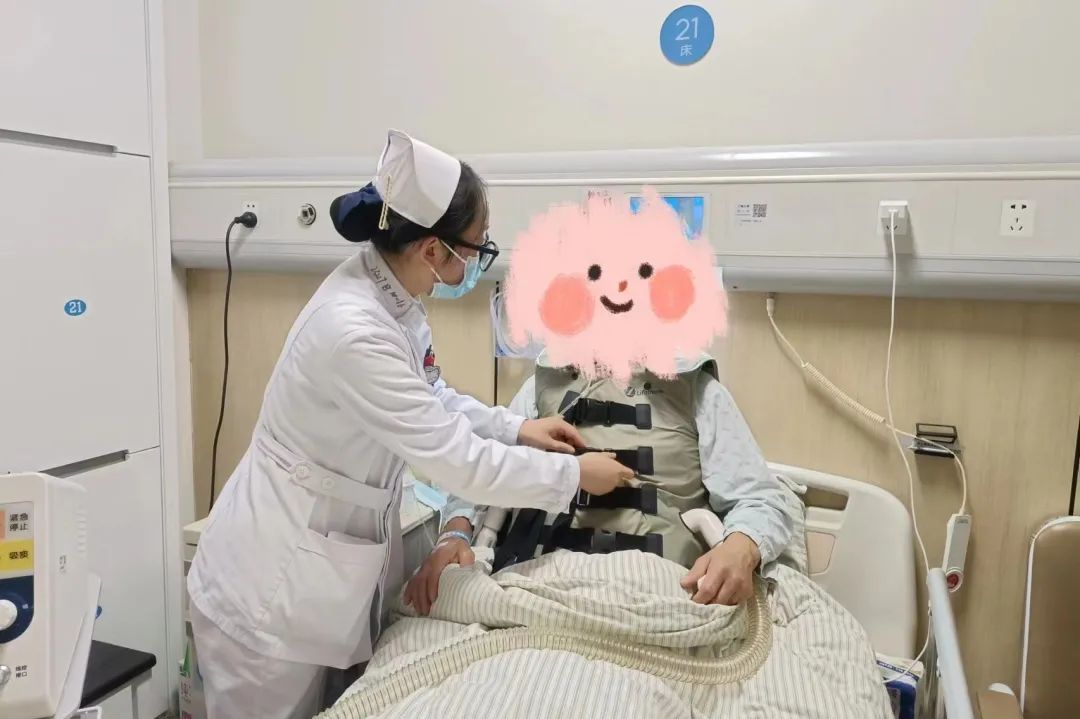 由于陈爷爷的痰液较粘稠,除了静脉用药、雾化,还使用了振动排痰仪。它是根据临床胸部物理低频振荡治疗的原理,从而促进呼吸道的顺畅,促进痰液的排出。用了一段时间后陈爷爷的痰液变少,病情也有所好转。后来我总是会利用空闲时间去跟陈爷爷沟通,教奶奶怎么给陈爷爷拍背排痰。