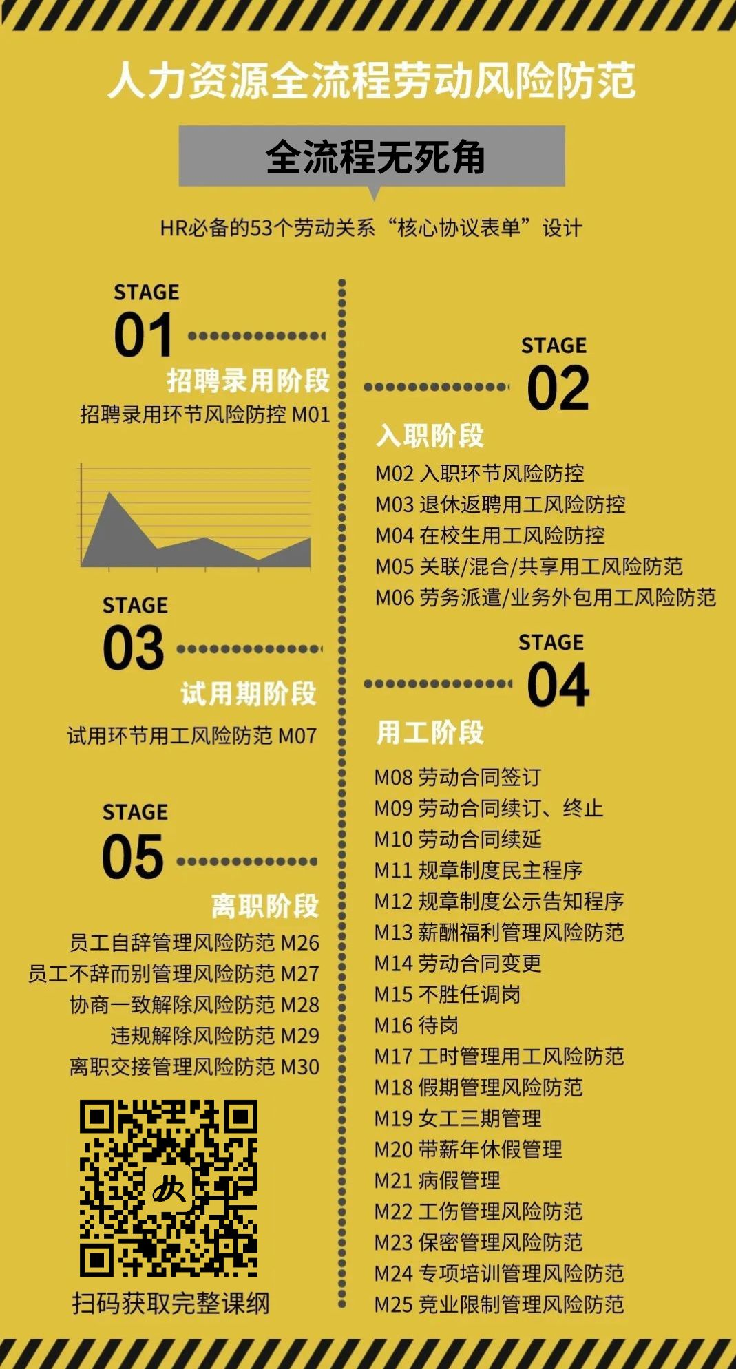 我们联合国内20多名专业劳动法律师,历时3年之久打造的《人力资源全流程劳动风险防范全攻略》上线!课程按照人力资源的全流程:招聘→入职→试用→任用→离职等5大模块设计,几乎做到全流程无死角!