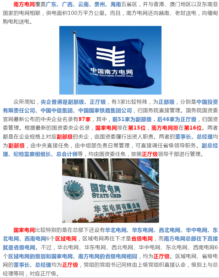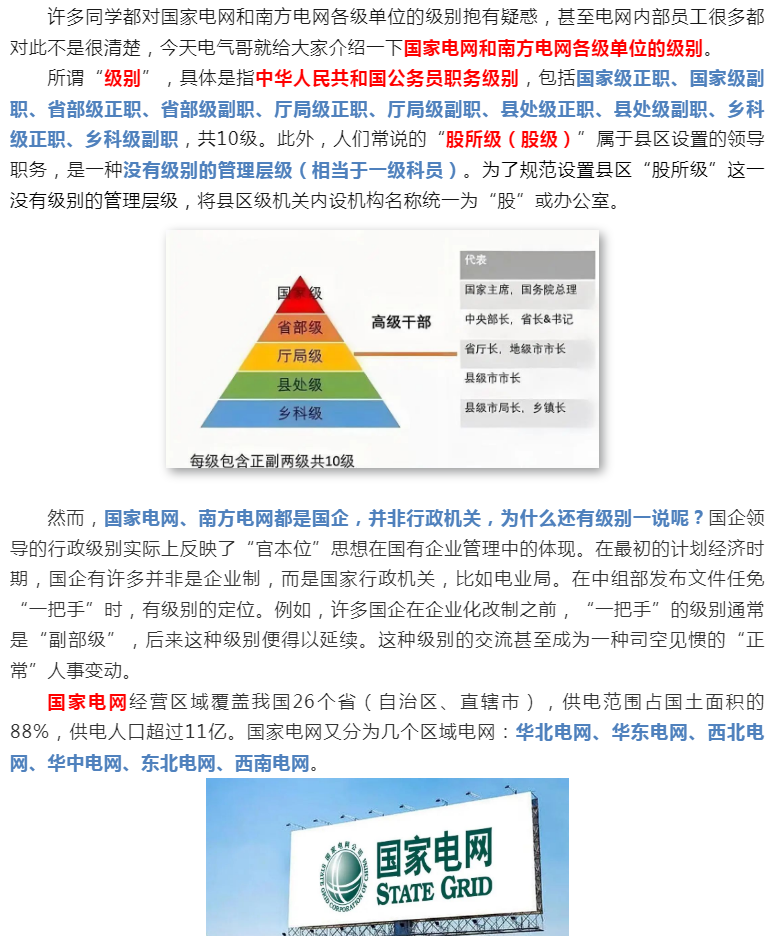 省级电网再往下就是各市级、县级公司了。市级公司为正处级单位(部分副省级城市或实力强的大市可能高配副厅),县级公司为正科级(部门经济大县可能高配副处)。