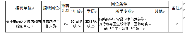 因工作需要,长沙市雨花区疾病预防控制中心面向社会公开招聘编外合同制人员2名,现将有关事项公布如下: