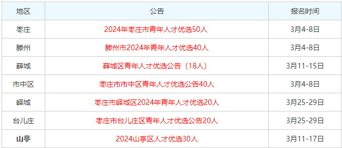 (一)发布公告。通过相关媒体和网站面向社会发布2024年优选公告。(二)网上报名。报名采取统一时间、网上报名、网上初审的方式进行。报名时间:2024年3月4日 9: 00—3月8日16:00查询时间:2024年3月4日14:00—3月9日16:00报名网站:枣庄市人力资源和社会保障局官网(http://zzhrss.zaozhuang.gov.cn/)1、个人报名。报名人员登录报名网站,如实填报、提交个人相关信息并上传近期正面免冠彩色证件照片(其中,报名人员手机号码务必填写正确,因通讯不畅造成的后果自负),系统生成《2024年枣庄市青年人才优选报名表》,提报资格初审。报名人员使用二代身份证报名,报名与考试使用的身份证必须一致。恶意注册报名信息、扰乱报名秩序的,查实后取消本次报考资格。2、网上初审。市青年人才优选工作办公室指定专人负责资格初审工作。报名人员生成《报名表》后,工作人员进行网上资格审核,并于24小时内通过报名系统反馈资格初审结果。报名人员在资格初审前多次登录提交报名信息的,后一次填报自动替换前一次填报信息,报名信息一经初审通过,不能更改。因提交报名信息不准确、不齐全或不符合报考条件等原因影响资格审核的,由报名人员承担相应后果。3、网上查询。报名人员在网上提交报名信息后,可在查询截止之日前登录报名网站,查询报名资格初审结果。网上初审通过的,在查询时间截止前,须下载打印《报名表》(内含《诚信承诺书》)。报名结束后,各优选岗位最终确定的报考人数如达不到2:1,则按相应比例核减优选数量,并将未完成的计划调剂到其他报名人数较多的岗位。(三)面试。面试采取结构化面试(或面谈)方式,根据最终进入面试的人数和考生学历分布情况分组进行,主要测试考生组织协调、分析判断、计划决策、逻辑思维、学习创新、语言表达、应变控制、专业素养、仪容仪表等方面能力素质。如通过资格初审人数过多,则增加初试环节,初试方式为面谈,最终按照面谈成绩由高分到低分1:3的比例确定进入面试人选,面谈成绩不计入面试成绩。面试满分100分,合格分数线为70分。面试成绩计算到小数点后两位,面试成绩在面试结束后公布。如同一岗位报考人数较多、需分在不同小组进行面试,则采用修正系数法计算考生最终成绩(计算公式为:考生面试修正成绩=考生面试原始成绩×修正系数〈同一岗位全体考生面试成绩平均值÷本面试室该岗位全体考生面试成绩平均值〉)。面试时间、地点等具体事宜另行通知,请注意随时关注“人才枣庄”微信公众号。(四)考察和资格复审。市青年人才优选工作办公室组成考察组,到人选所在高校或所在社区开展考察,并按照资格条件对考察人选进行资格复审。考察采取差额考察方式进行,在面试合格分数线以上,根据面试成绩由高分到低分按职位计划1:1.5比例依次确定考察人选,成绩相同的均确定为考察人选。考察时,侧重考察人选的思想政治表现、道德品质、综合能力和学习成绩等方面情况,同时提取、审核考察对象档案,对考察对象是否符合规定的资格条件进行复审。审核档案时,如档案重要材料不全、个人经历不明、历史状况不清且无法进行有效考察的;档案中存在涂改造假问题,情节较重的,一律不作为优选引进人选。考察组根据人选考察情况,综合分析提出考察合格人选名单。(五)体检。对考察合格人员,按引进计划1:1的比例确定进入体检范围人选,并统一组织体检。体检参照公务员录用体检标准执行。对按规定需要复检的,不得在原体检医院进行,复检只能进行1次,结果以复检结论为准。除特殊情况经市青年人才优选工作办公室同意外,报名人员不按规定的时间、地点参加体检的,视作放弃体检。体检合格人员放弃的或因体检不合格出现空缺的,从考察合格人选中依次等额递补。(六)公示引进。根据面试、考察、体检等情况,确定拟优选引进人选,在报名网站公示,公示期为5个工作日。公示期满没有问题反映的或反映问题不影响引进的,签订引进协议,办理聘用手续。发现有影响引进的问题并查证属实的,取消引进资格,出现的空缺名额,按照有关规定履行相应程序后进行岗位调剂、递补、公示。资格审核贯穿优选工作全过程。发现报名人员有弄虚作假等违纪违规行为并查证属实的,取消优选资格。(一)岗前培训。优选的青年人才正式到岗前,组织岗前培训。(二)试用期管理。优选的青年人才与枣庄市青年人才储备中心签订试用期合同,办理聘用手续,工资和社会保险等由枣庄市财政负担,试用期为1年。试用期满考核合格的,办理转正定级手续;试用期满考核不合格的,不再聘用。聘用到专业技术岗位的,可按照职称评聘有关规定优先评聘到相应专业技术岗位。(三)基层挂职锻炼。优选的青年人才正式聘用后,先不分配到具体单位,统一组织到基层挂职锻炼,时间一般为1年(含试用期)。挂职期满,由组织部门统一组织考核,并综合考虑表现情况、专业背景等因素,安排到市直事业单位工作。对于本人志愿留在基层工作的,可根据工作需要予以安排。(四)后续管理。优选的青年人才,作为机关事业单位后备人才和优秀年轻干部重要来源,最低工作年限为5年(含试用期),由组织人社部门统一管理。对工作表现优秀的,经推荐优先纳入后备干部队伍管理;博士、硕士可在编制职数空缺范围内优先落实正科级、副科级职务,工作满3年