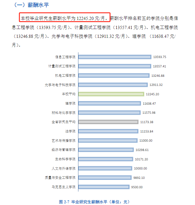 ③中国计量大学:毕业研究生薪酬水平为12245.20元/月。薪酬水平排名前五的学院分别是信息工程学院(13593.75元/月)、计量测试工程学院(13557.41元/月)、机电工程学院(13246.88元/月)、光学与电子科技学院(12911.32元/月)、理学院(11638.47元/月)。