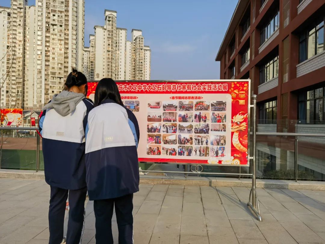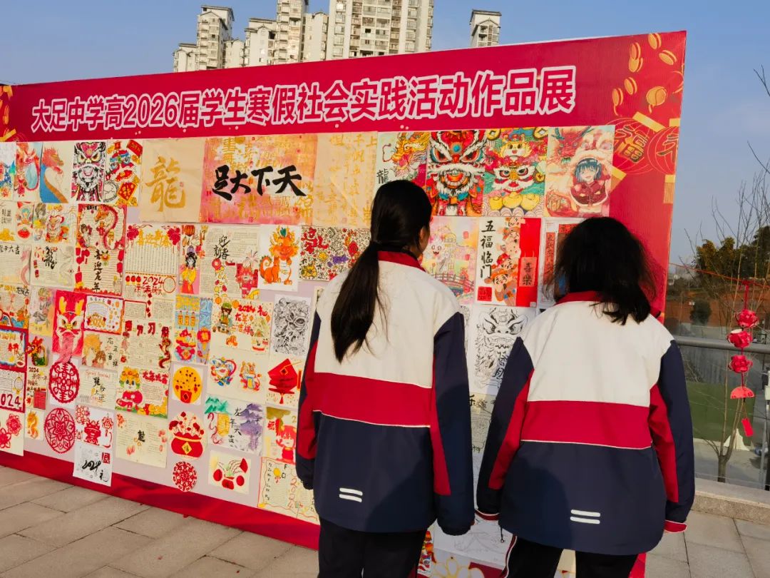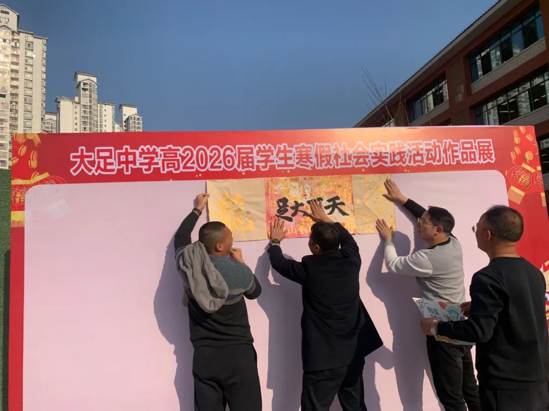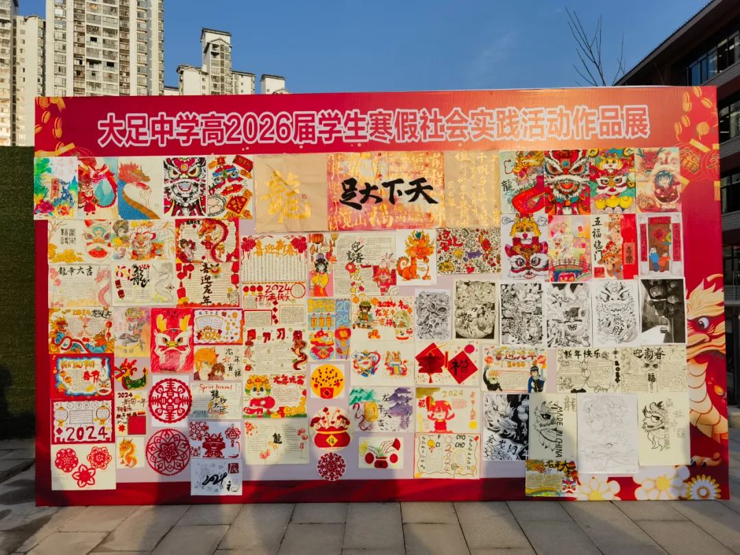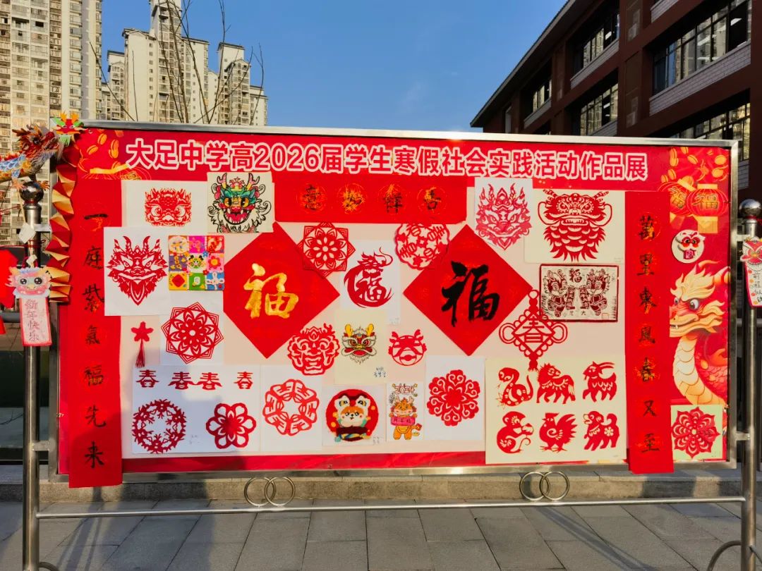 为了践行“五美”教育理念,丰富学生假期生活,传扬中国传统文化,我校高2026届组织学生于寒假期间进行了春节手工作品的制作以及大足石刻志愿服务的社会实践活动,并于开学第一天进行了汇报展出。