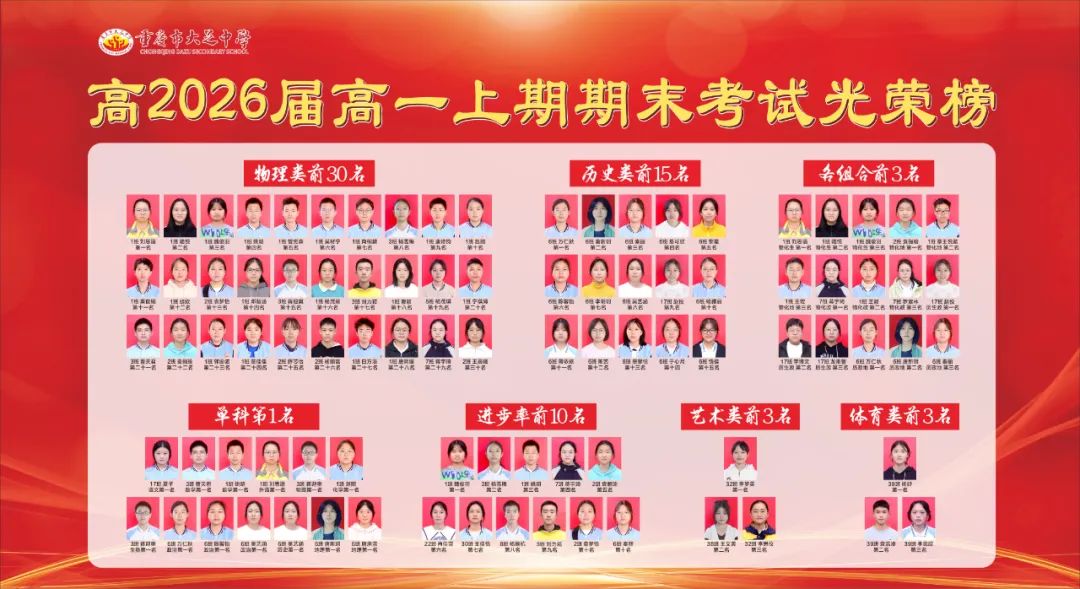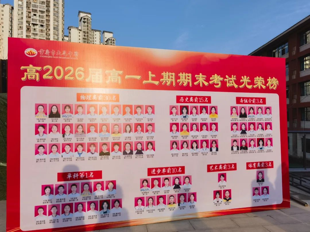 此外,正值开学之际,高一年级还特地制作了展板“高2026届高一上期期末考试光荣榜”,用以表彰先进、鼓励后学。