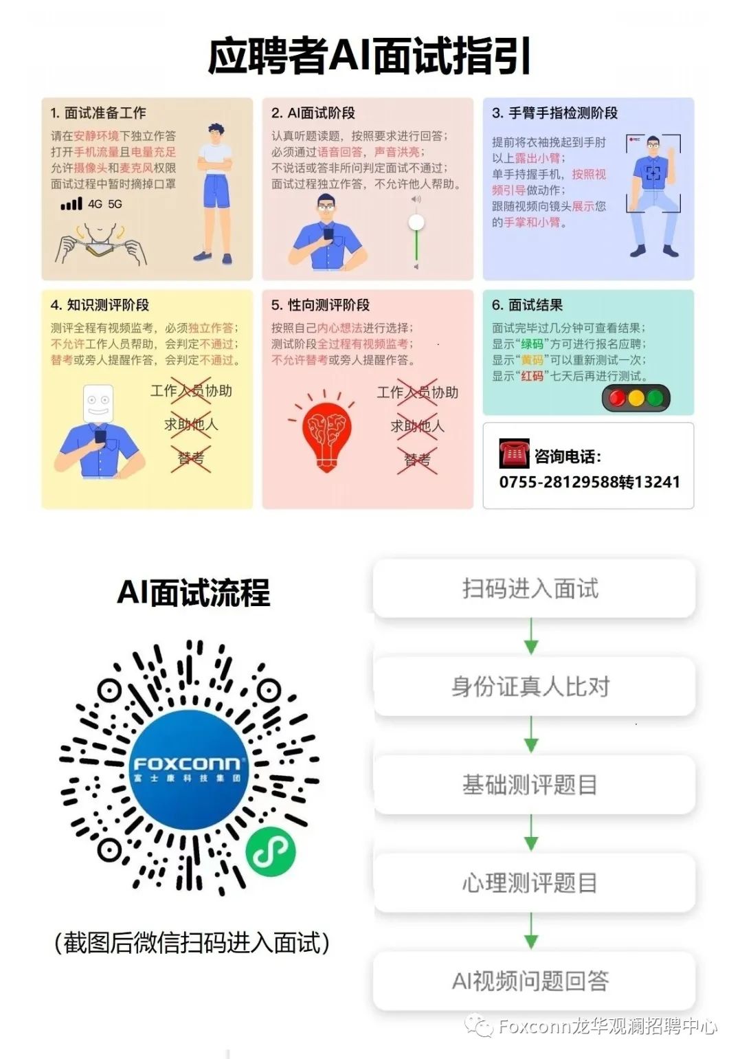 温馨提示: 1.应聘者AI面试完成后,收到人资通过初审短信,按照短信内容前往招募中心 (直接刷身份证进入),进入后全程会有红黄马甲工作人员接待。