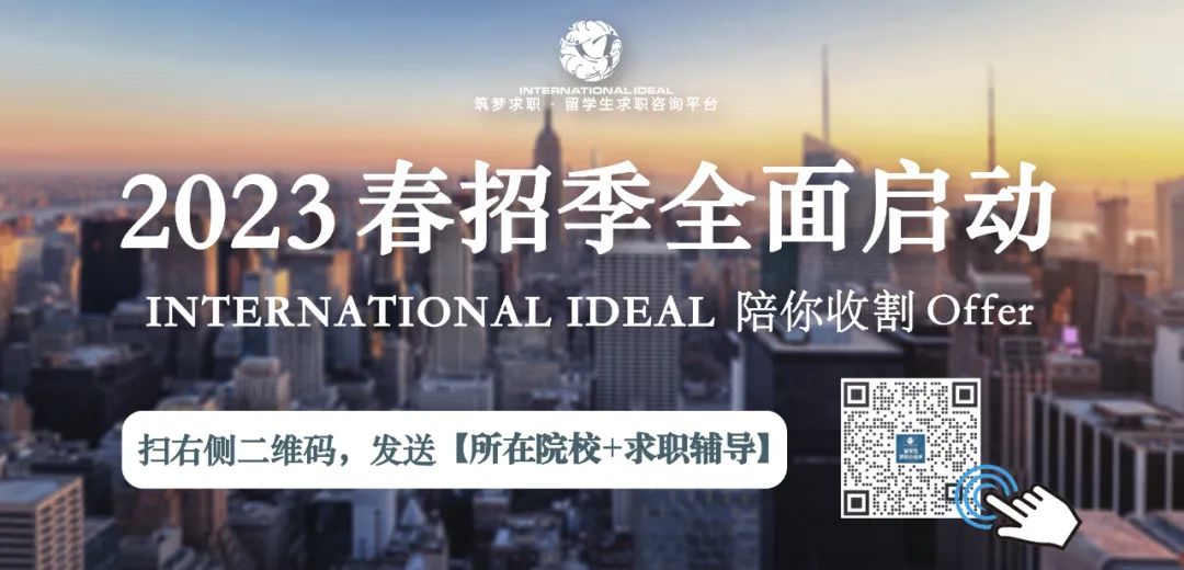筑梦求职 INTERNATIONAL IDEAL ,2014 年成立于美国,是北美最早成立的留学生求职咨询平台之一。我们是宁波人才服务中心战略合作伙伴,并荣登福布斯全球华人精英TOP100及胡润百富创业领袖榜单,至今已帮助 8000+ 学员获得来自 Goldman Sachs, McKinsey, Deloitte, P&G 等企业 offers。我们的服务包括:求职咨询、背景提升、名企内推、海内外招聘等;商务合作请联系:Coop@internationalideal.com