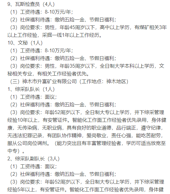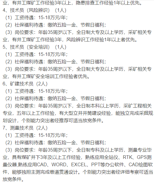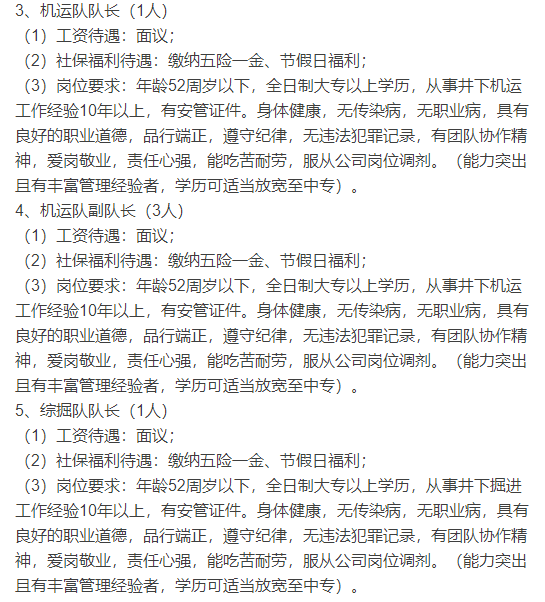 (3)岗位要求:男性,年龄45周岁以下,高中以上学历,有煤矿相关3年以上工作经验,采掘一线1年以上工作经历。