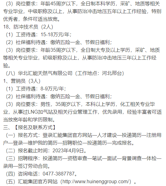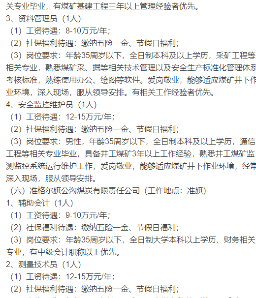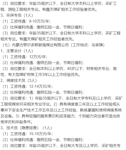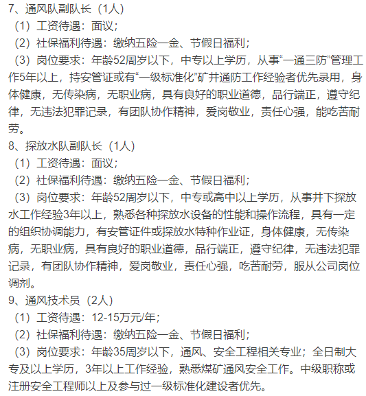 (3)岗位要求:35周岁以下,全日制本科以上学历,煤矿通风与安全相关专业毕业。