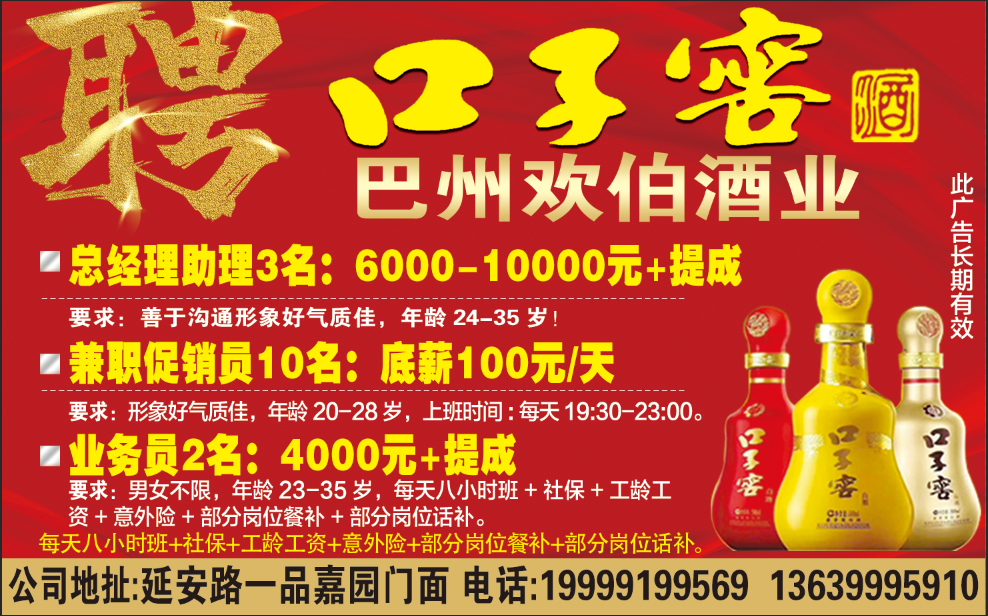 伊力特酒业公司招财务人员、业务数名,有工作经验优先。电话:2700666 18997606630