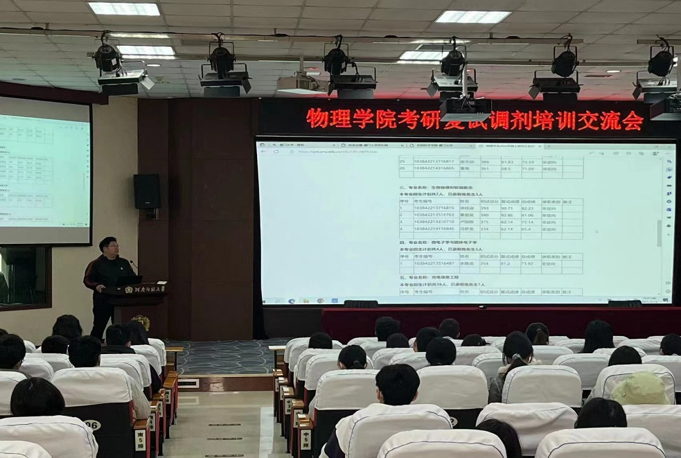 为助力2023届考研学生考研复试及调剂工作,物理学院于3月20日在物理北楼三楼报告厅召开2023届考研复试调剂培训交流会,2023届200余名本科生参加了本次交流会。