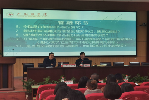会议中,徐晓结合多年研究生招生工作经验,围绕复试准备、信息收集、调剂思路、调剂技巧等方面为学生们进行了耐心的讲解,随后向学生们提出了三点建议:第一,要密切关注目标院校复试信息,认真研究复试成绩计算方式,准确寻找发力点,避免精力的盲目消耗。同时提醒学生们初试分数高也不能大意,要认真准备复试,不可掉以轻心。第二,要掌握复试内容重点,静心构筑知识体系与分析思路,面试时语言要有逻辑性,临场反应要灵活,要突出自身亮点和优势。第三,要主动作为,互帮互助,积极拓宽复试、调剂信息渠道,广泛搜集信息,整合多方资源,把握时机,不轻言放弃。最后,在互动答疑环节中,徐晓老师就学生们提出的复试和调剂的问题进行逐一解答,并鼓励学生们鼓足干劲,顺利跑完“最后一公里”。