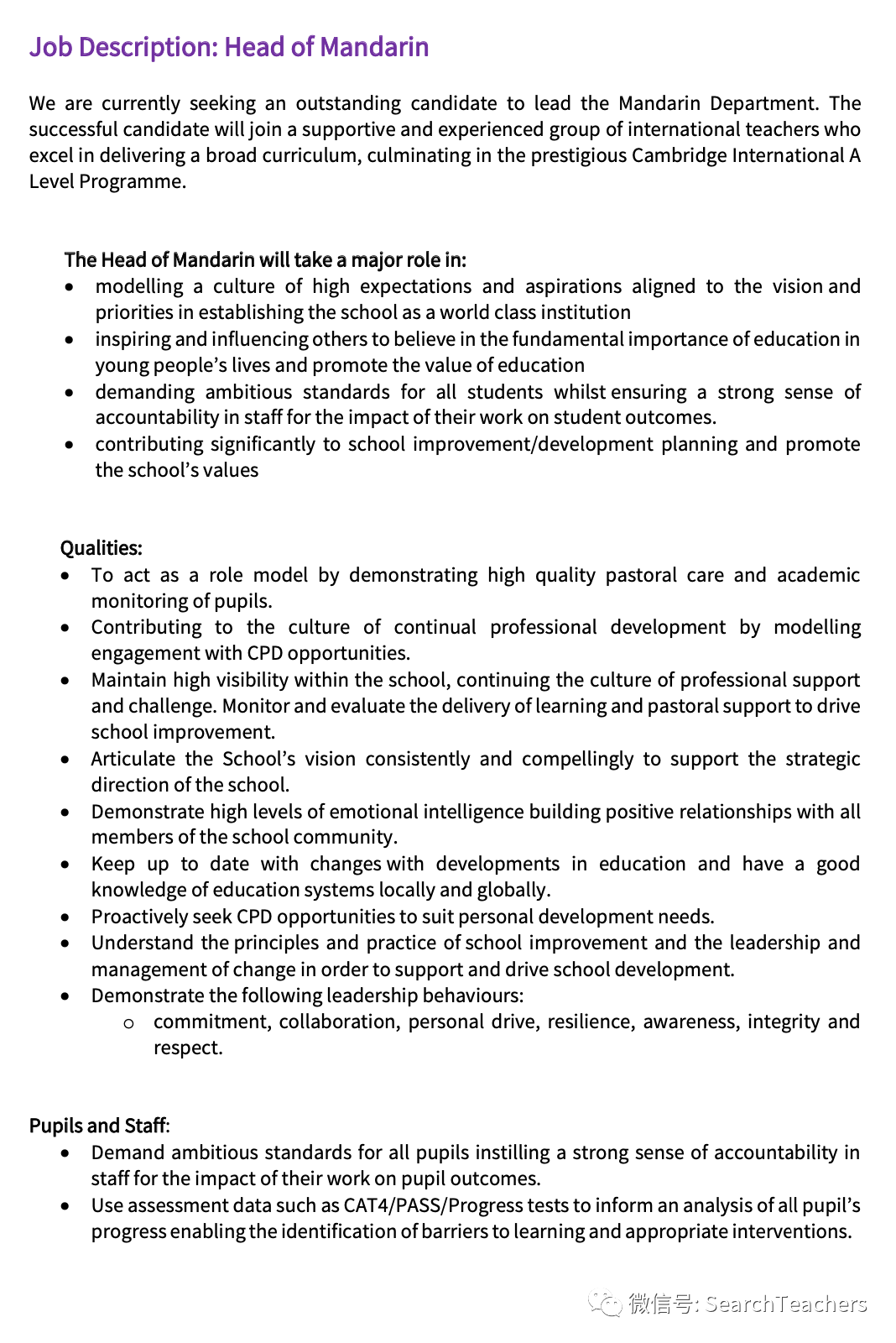 免责条款:本平台非赢利,对接国际学校(教育机构)和应聘者,在初期主要是提供国际学校中文教师,双语教师的岗位需求信息。从2022年起开始大量提供全部科目的招聘信息,特别是理科、人文科和社会科。我们正在扩容资讯来源,并且邀请更多的成员进入我们的核心团队,以更好地服务我们的粉丝。需要特别强调的是:本平台所获取的资讯是从国际学校的官方网站,或者教育机构的人力资源部门直接复制粘贴过来的,真实性和有效度需要应聘者自行辨别。由此产生的法律风险,招聘应聘双方来承担。本平台不负责审核招聘方的资质,请应聘者谨慎而为。