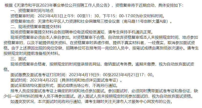 天津市和平区2023年事业单位公开招聘工作人员资格复审、面试的通知