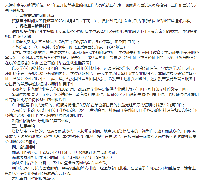 天津市水务局所属单位2023年公开招聘事业编制工作人员资格复审和面试通知
