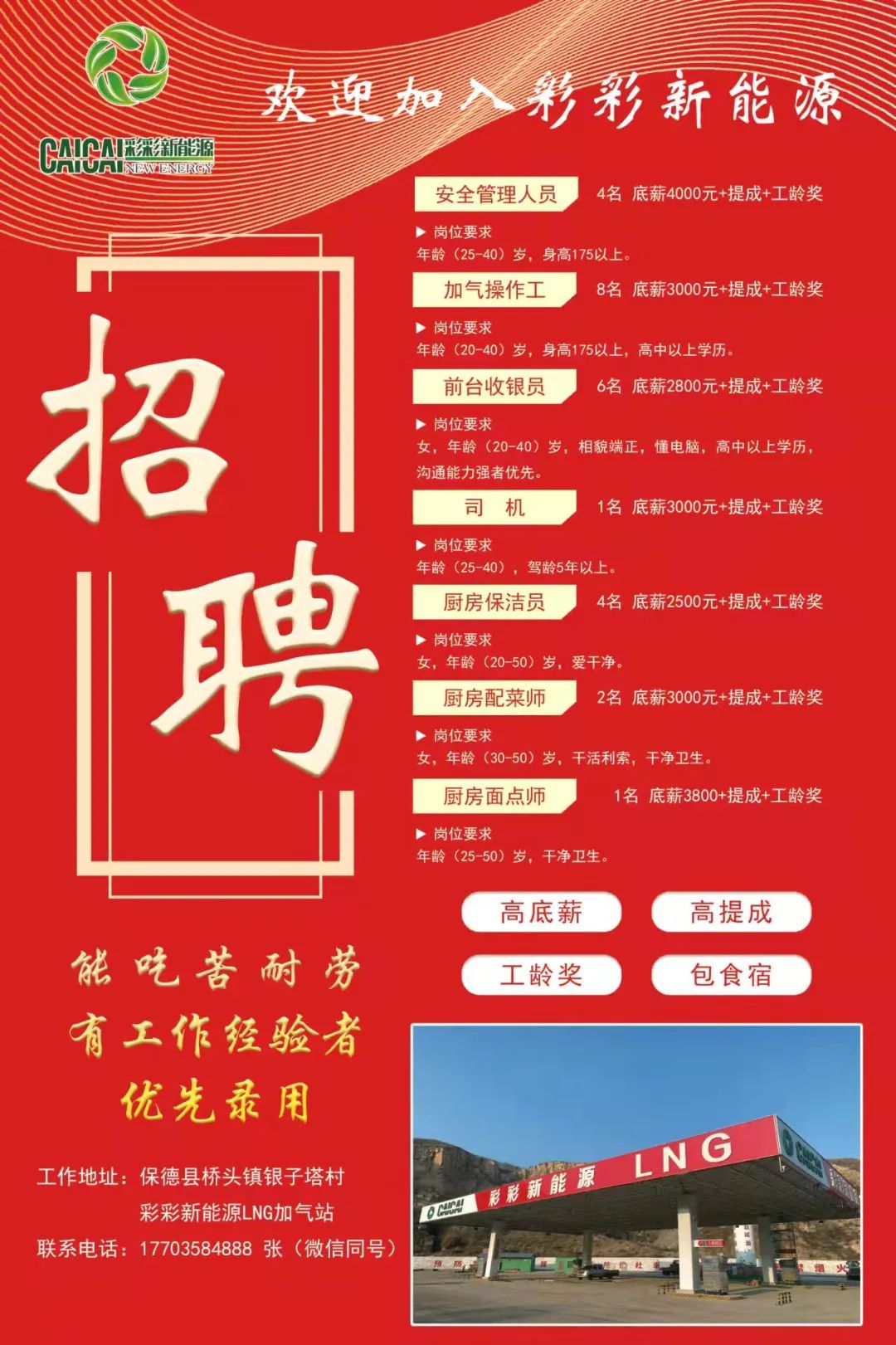 彩彩新能源保德分公司LNG加气站现招聘一批优秀员工,详情如下面图中所述,地址:山西省忻州市保德县桥头镇银子塔村338国道北侧,退伍军人优先,应聘有工作经验者优先,应聘热线:17703584888(微信同号) (張鋒偉:17703584888)