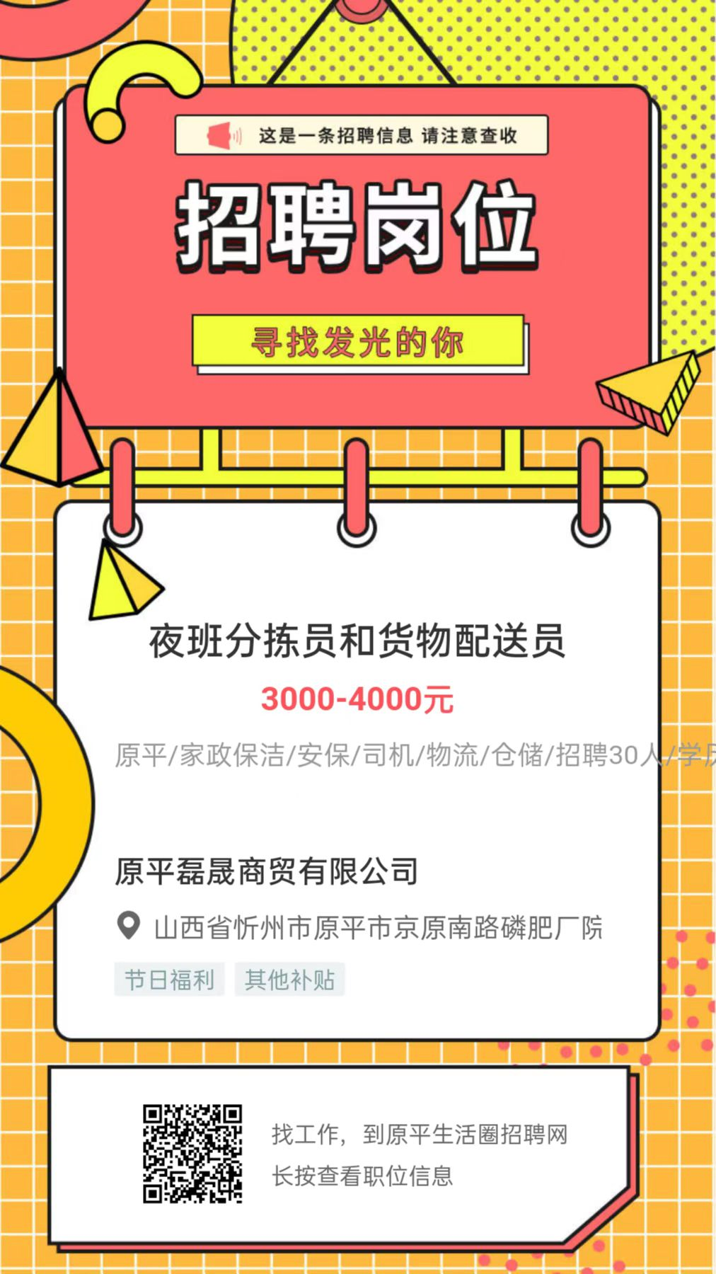 【最新招聘】原平磊晟商贸有限公司招聘夜班分拣员、货物配送员