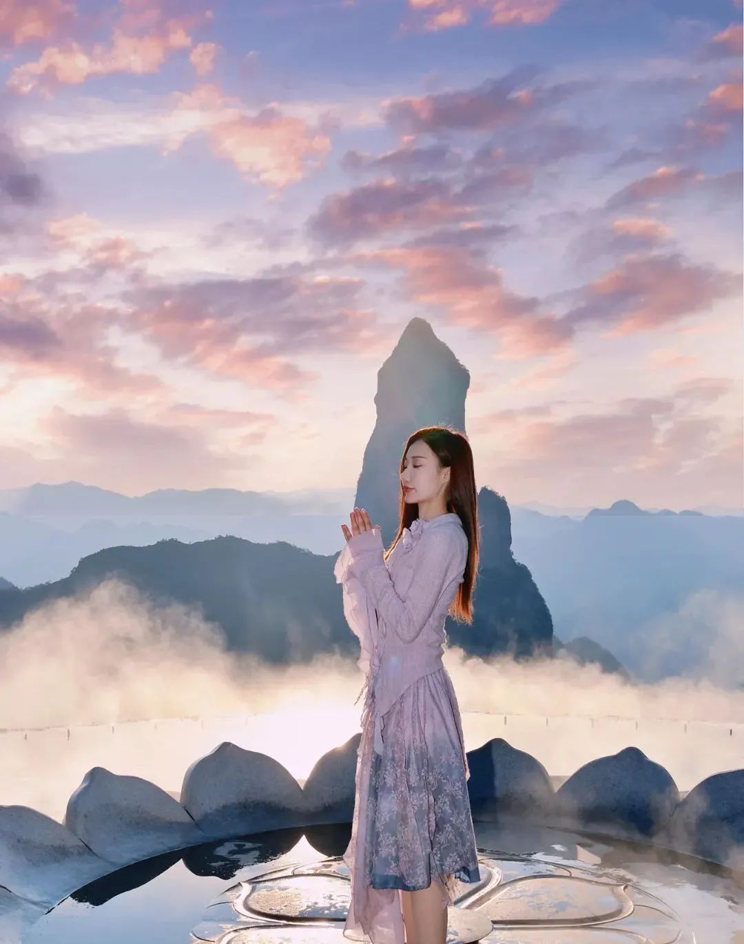 佛影莲韵,正对观音峰。云雾缭绕时,仙气飘飘;日落霞光时,佛光耀耀。