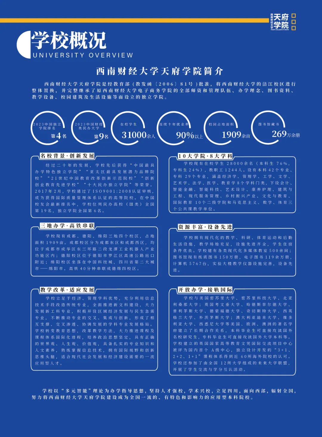 西南财经大学天府学院是经教育部(教发函【2006】81号)批准,将西南财经大学的涪江校区进行整体置换,并完整继承了原西南财经大学电子商务学院的全部师资和管理队伍、办学理念、图书资料、教学设备、校园建筑及生活设施等而设立的独立学院,办学层次为全日制普通本科高等院校。