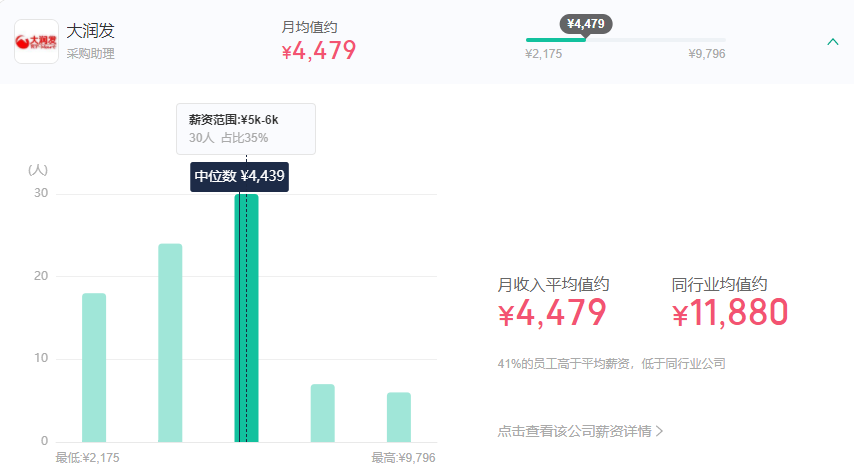 其中还有根据网友分享统计,大润发平均工资为9247元/月,其中34%的工资收入位于区间4000-5000元/月,27%的工资收入位于区间3000-4000元/月。据分析数据统计,大润发年终奖平均3080元。可见与1W+的收入差距之大。