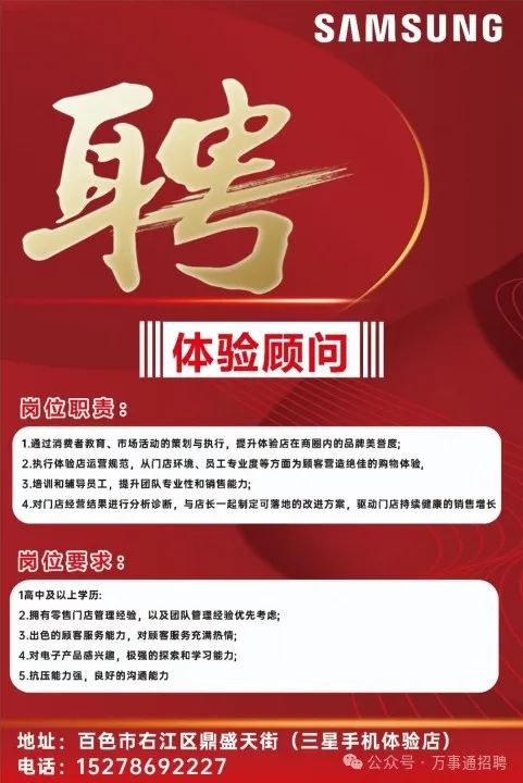 招聘单位 : 百色鼎盛天街三星授权体验店