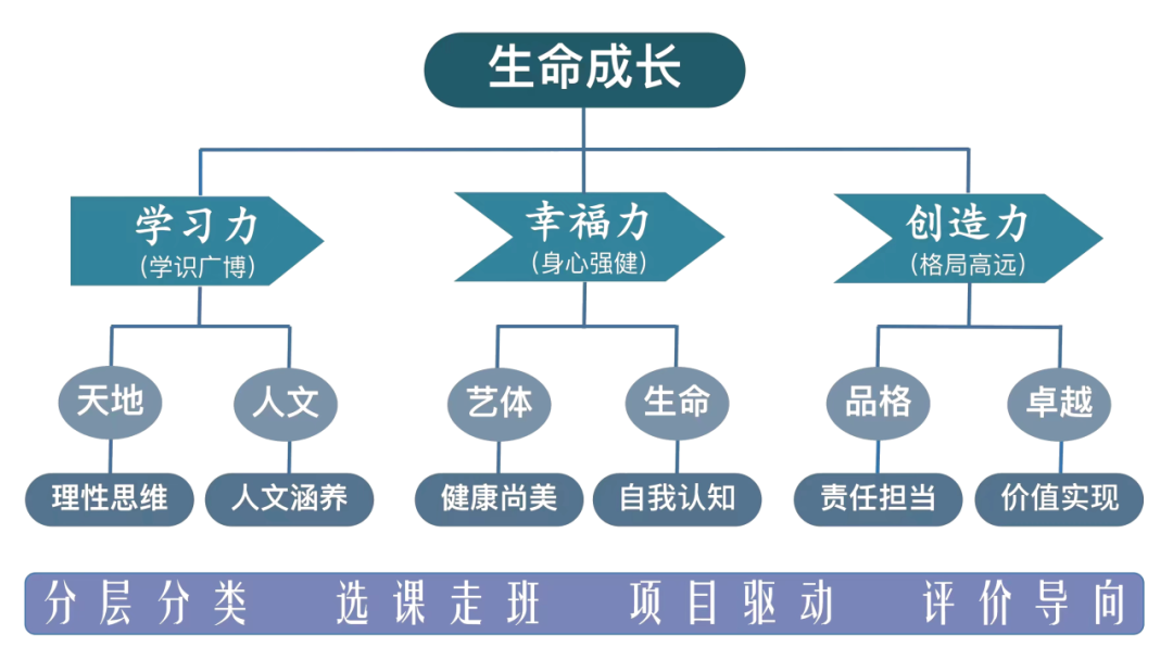 元音中学以“教天地人事,育生命自觉”为课程主张,以三大核心能力“学习力、幸福力、创造力”为课程支点,精心构建了“天地、人文、艺体、生命、品格、卓越”六大类课程,课程实施采用“分层分类,选课走班”策略并以项目式任务驱动。