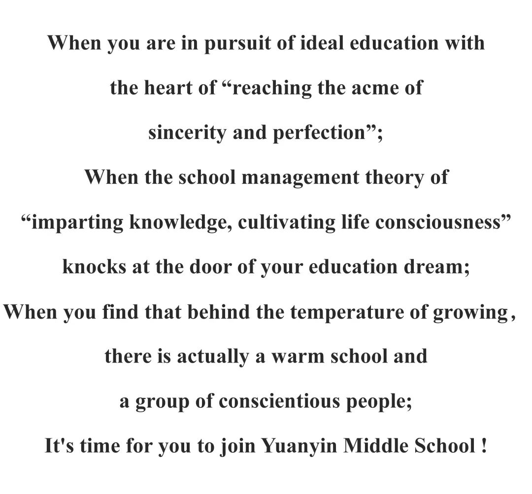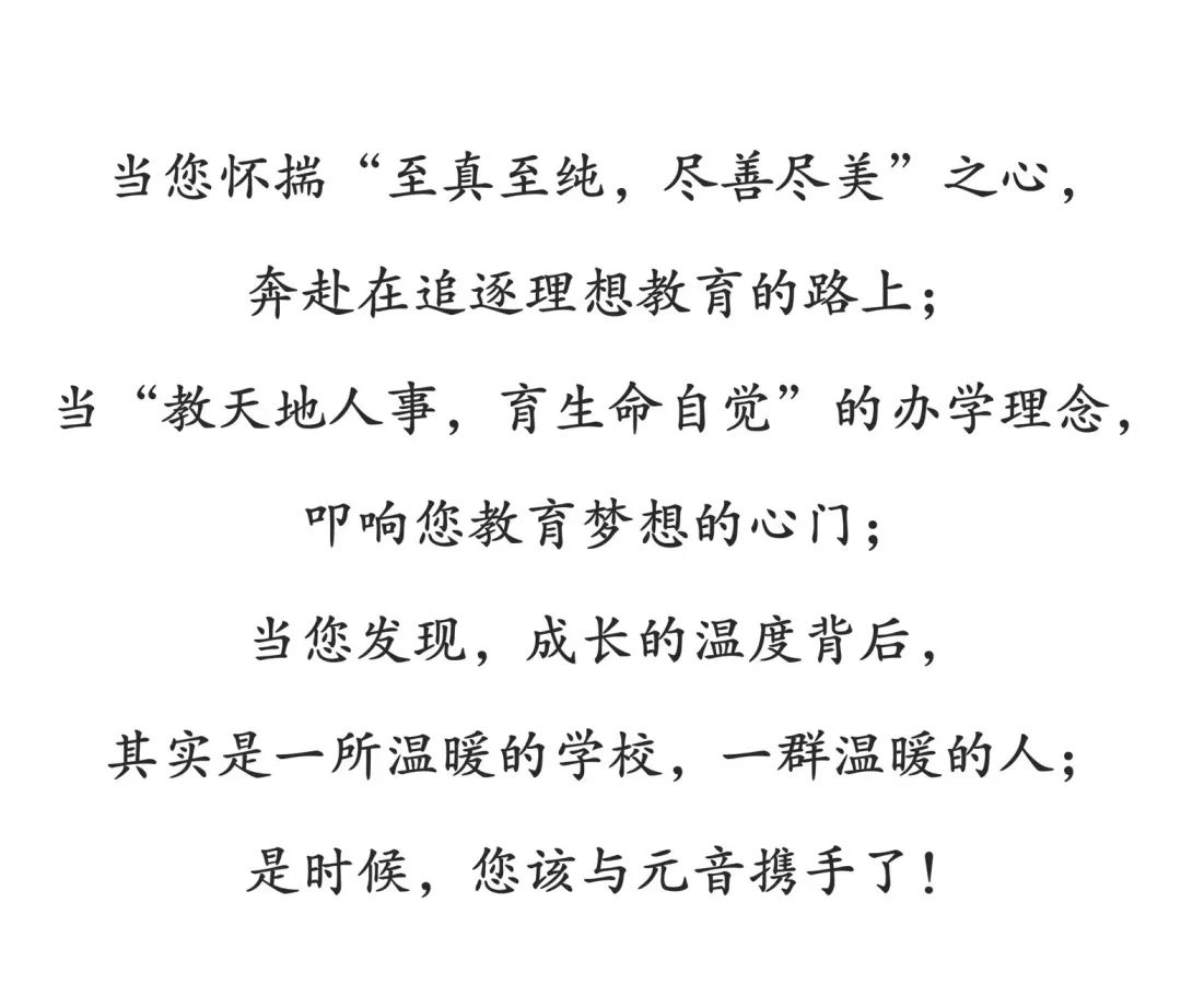 由于元音中学卓越的品质定位和长远的发展需求,学校将进一步吸纳储备优质人才,现面向社会招聘初中各学科教师、优秀管理干部及学校宣传干事。让我们一起走近元音,聆听教育最纯真的声音,欣赏“一生一世界,一师一风景”的新时代教育风景,让她唤醒你内心深处对生命最虔诚的尊重与敬畏——
